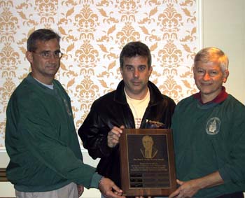 Investigator Joseph Taussi of the Middlesex County Prosecutor’s Office (center) receives the Paul Scully Service Award for 2003 from NJ-IAI Division President Tim Sethman and Board Chairman Joe Racite.